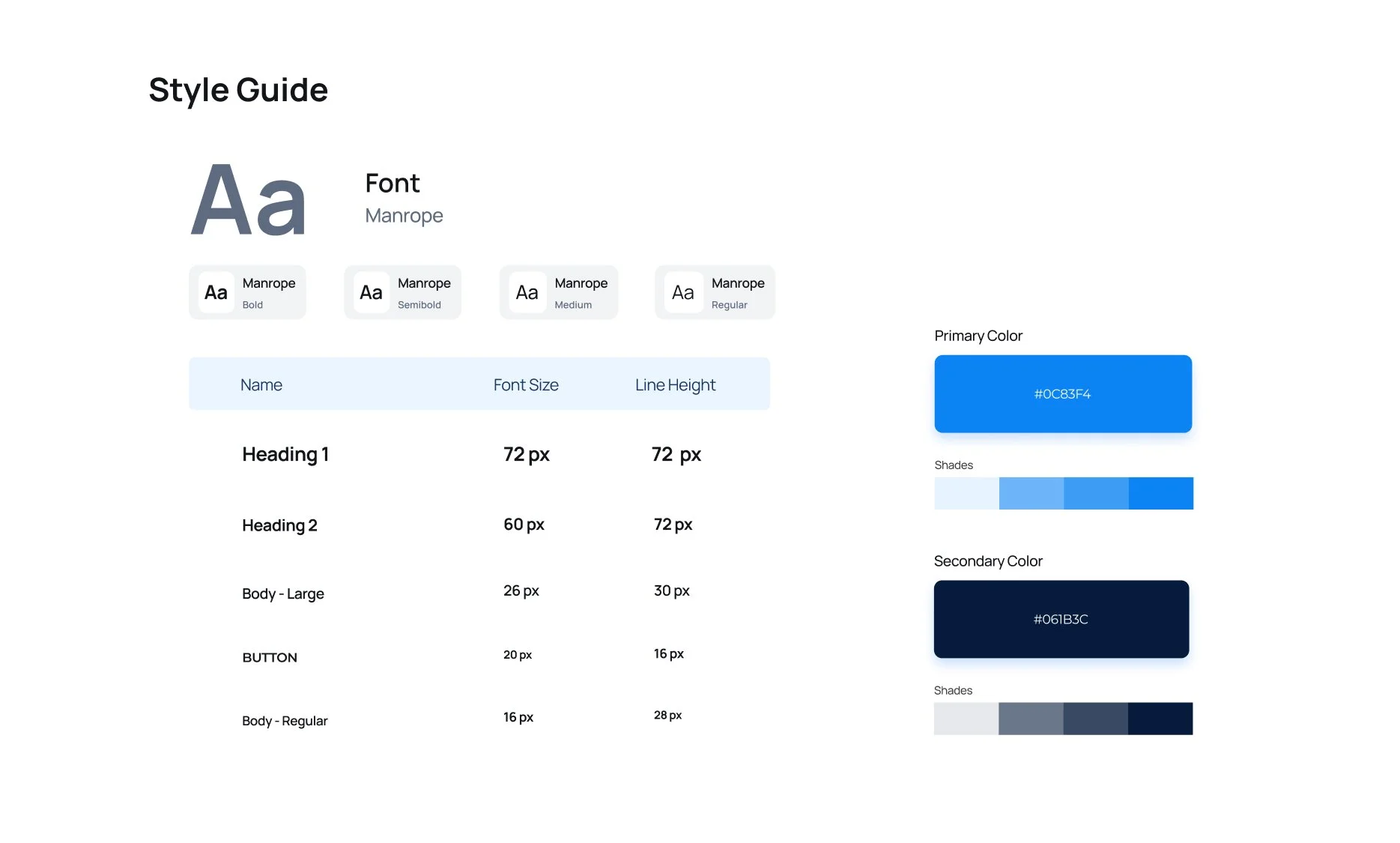 The style guide establishes a clean, modern visual system using the Manrope typeface and a refined blue-and-navy palette, enhancing brand trust, readability, and overall consistency across the experience.