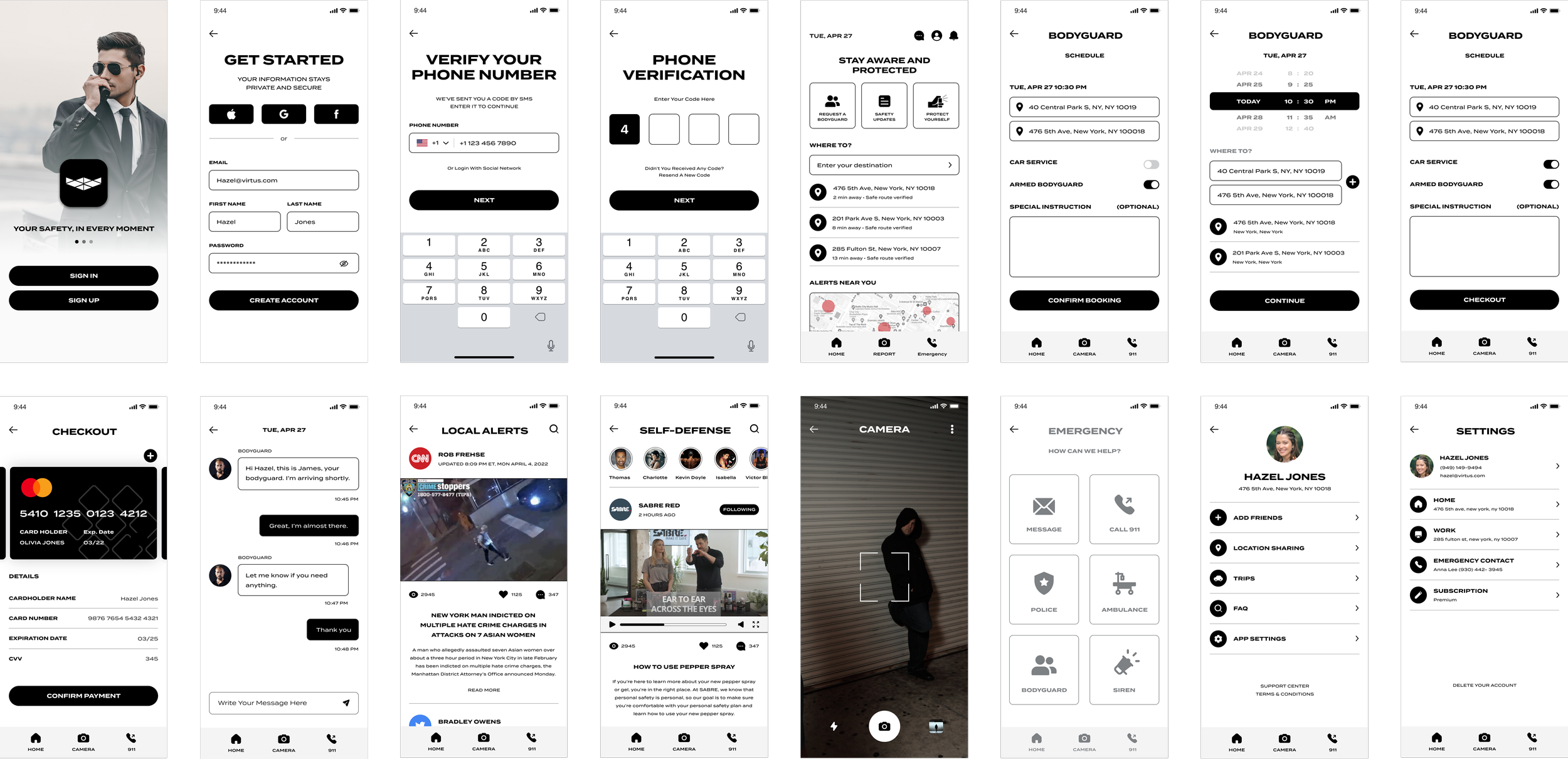 These low-fidelity wireframes were created to establish the structural foundation of the Virtus app before moving into visual design. They outline the core user flows: account creation, phone verification, the dashboard, bodyguard booking, self-defense lessons, alerts, messaging, emergency actions, and profile management. By focusing on layout, hierarchy, and task paths rather than visual styling, the wireframes allowed me to validate functionality, streamline navigation, and ensure that every feature directly supported user needs identified during research. This stage helped clarify how users move through the app in moments that require clarity and speed, setting the groundwork for an intuitive and reliable safety experience.