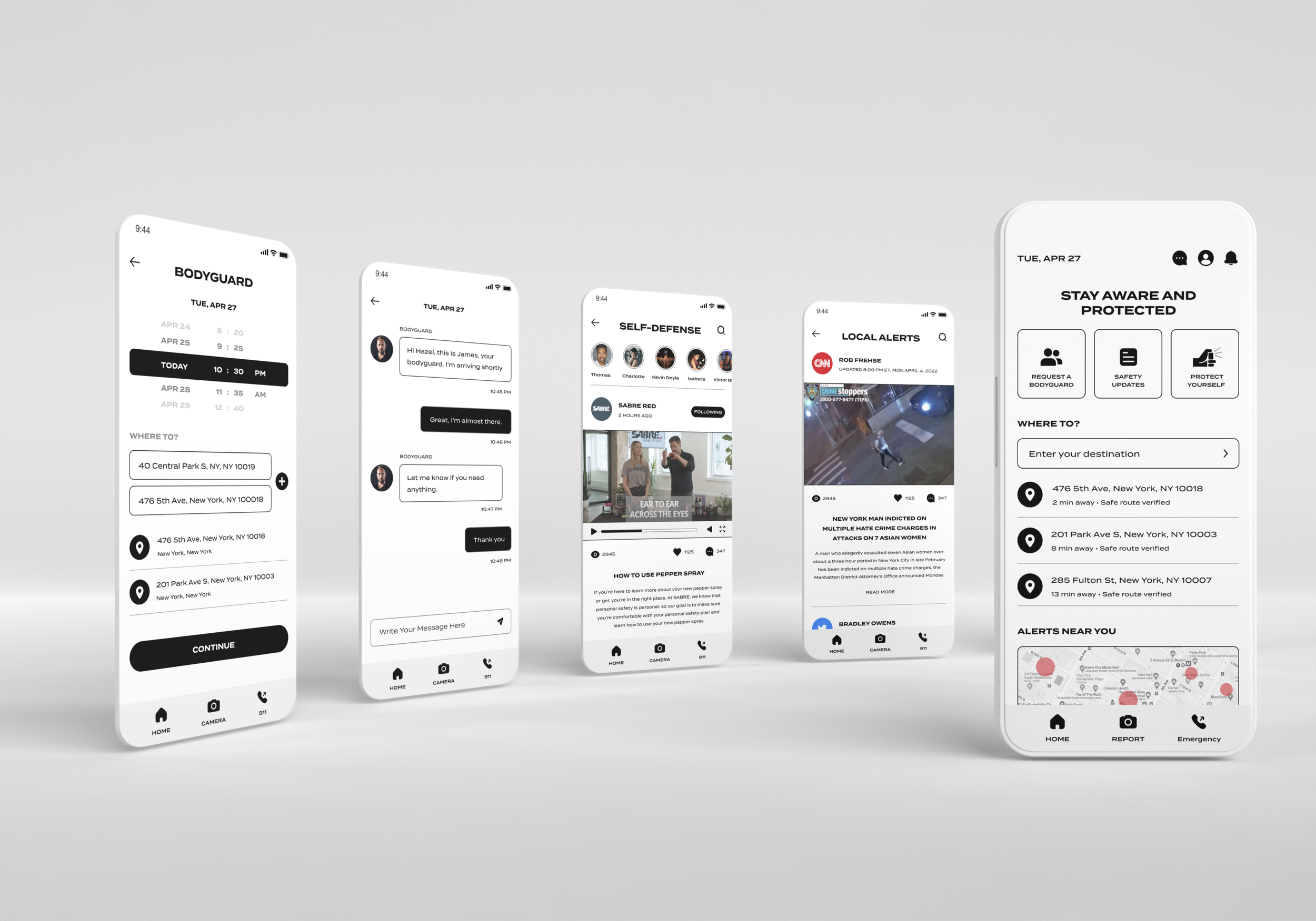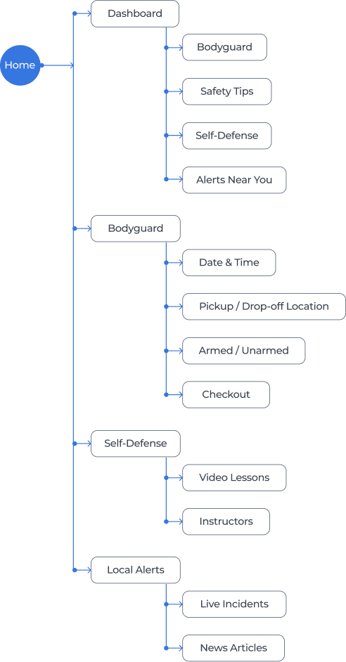 This structure ensures that users can navigate confidently in any context—whether they’re scanning alerts before leaving home, booking a bodyguard for a late-night commute, or learning self-defense techniques. The result is a streamlined system that keeps critical information close and reduces friction throughout the experience.